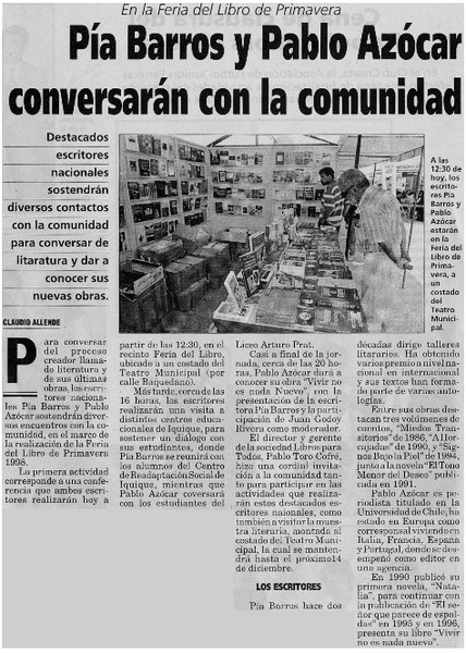 Pía Barros y Pablo Azócar conversarán con la comunidad [artículo].