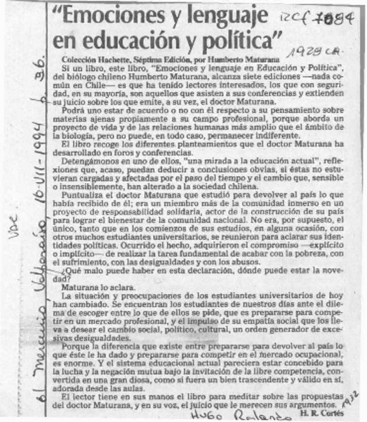 "Emociones y lenguaje en educación y política" [artículo] H. R. Cortés.