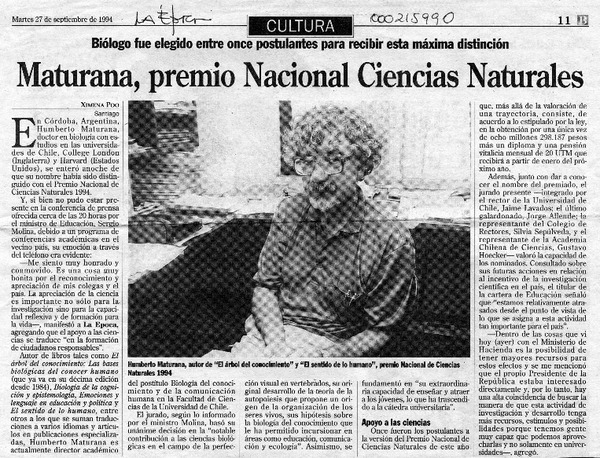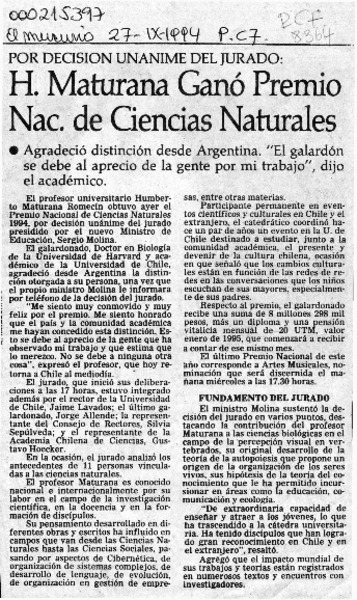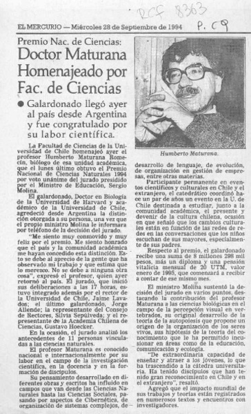 H. Maturana ganó Premio Nac. de Ciencias Naturales [artículo].