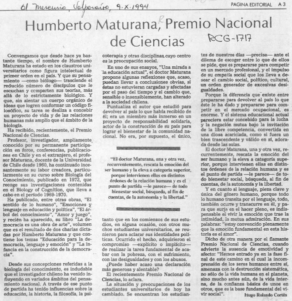 Humberto Maturana, Premio Nacional de Ciencias [artículo] Hugo Rolando Cortés.