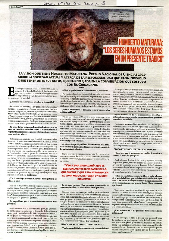 Humberto Maturana : "Los seres humanos estamos en un presente trágico" [artículo] Claudia Pedreros, Cristian Sotomayor y Francisco Luna