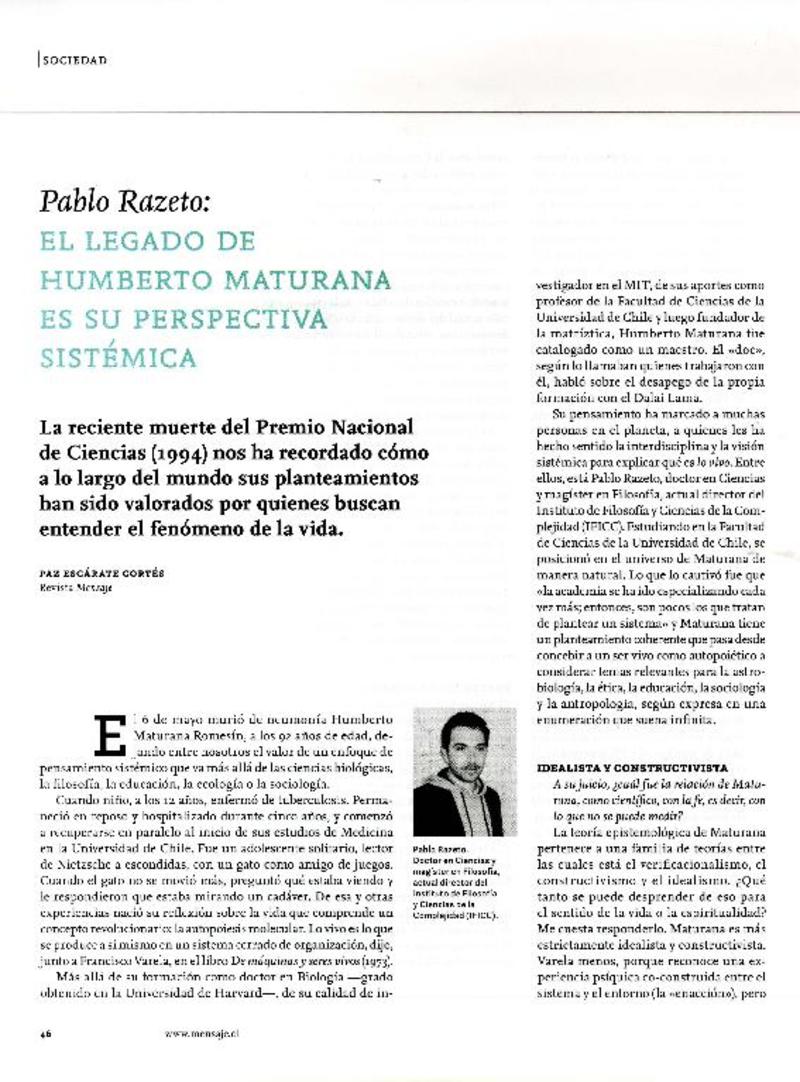 Pablo Razeto: El legado de Humberto Maturana en su perspectiva sistémica [entrevista] [artículo] : Paz Escárate Cortés.