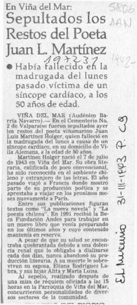 Sepultados los restos del poeta Juan L. Martínez [artículo] Audénico Barría Navarro.