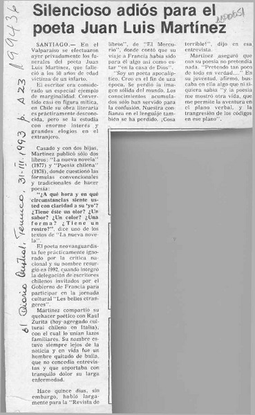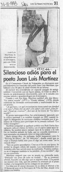 Silencioso adiós para el poeta Juan Luis Martínez [artículo].