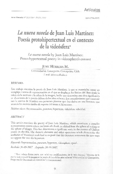 La nueva novela de Juan Luis Martínez: Poesía protohipertexual en el contexto de la videósfera [artículo]Juan Herrera M.