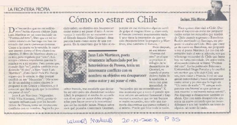 Cómo no estar en Chile Juan Luis Martínez, poeta vivamente influeciado por los heterónimos de Pessoa ... [artículo] : Enrique Vila-Matas.