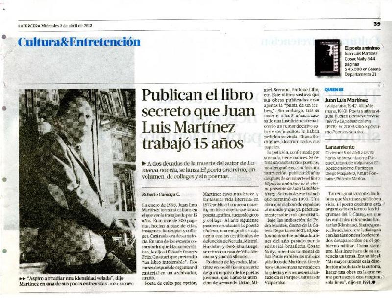 Publican libro secreto que Juan Luis Martínez trabajó 15 años [artículo] Roberto Careaga C.