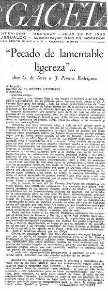 "Pecado de lamentable ligereza"... [artículo] Guillermo de Torre.