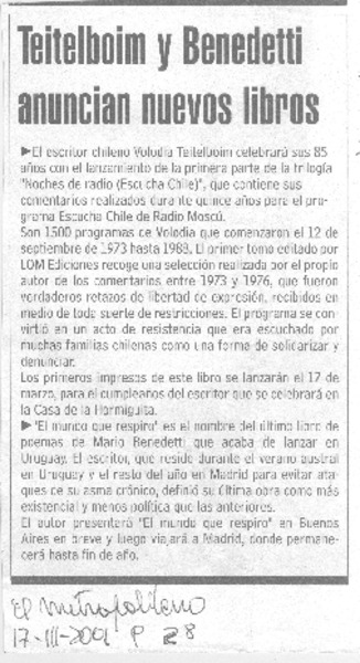 Teitelboim y Benedetti anuncian nuevos libros. [artículo]
