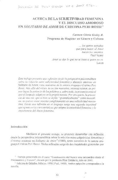 Acerca de la subjetividad femenina y el discurso amoroso en Solitario de amor de Cristina Peri Rossi [artículo]Carmen Gloria Godoy R.