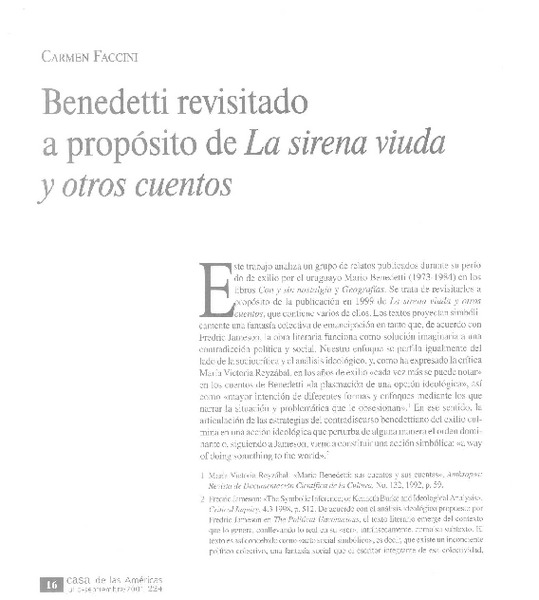 Benedetti revisitado a propósito de La sirena viuda y otros cuentos [artículo] Carmen Faccini.