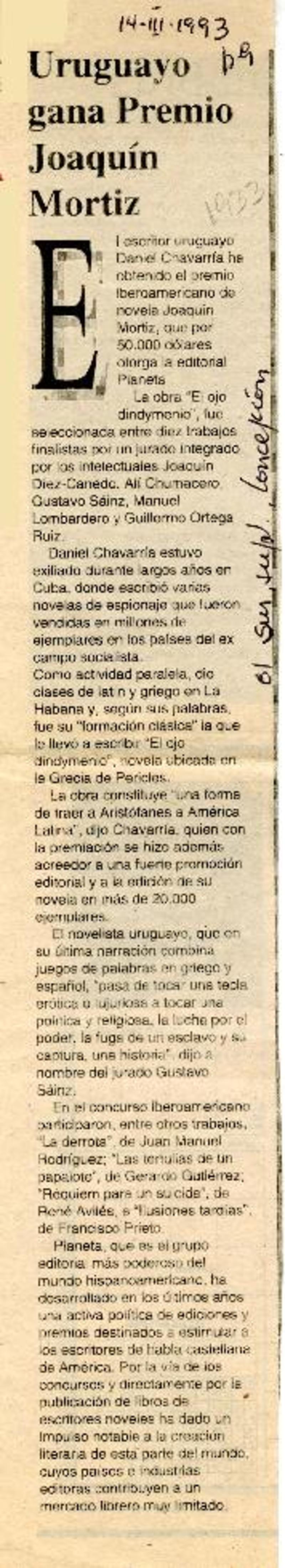 Uruguayo gana premio Joaquín Mortiz [artículo].