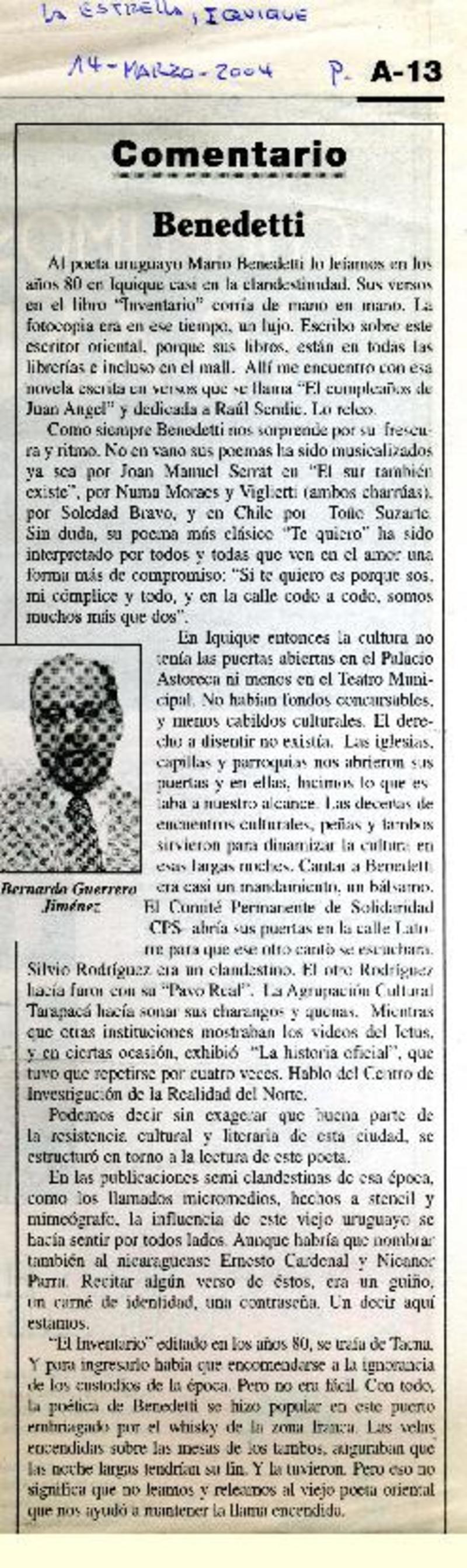Benedetti [artículo] Bernardo Guerrero Jiménez.