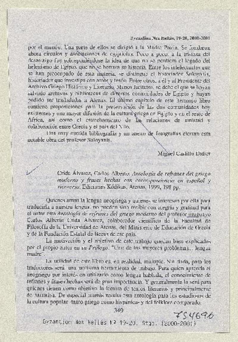 Antología de refranes del griego moderno y frases hechas con correspondencia en español y viceversa [artículo] Miguel Castillo Didier.