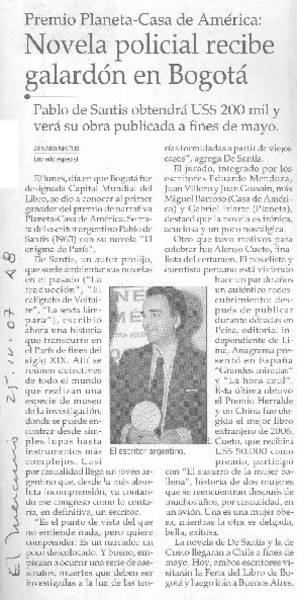 Novela policial recibe galardón en Bogotá [artículo] Alvaro Matus.