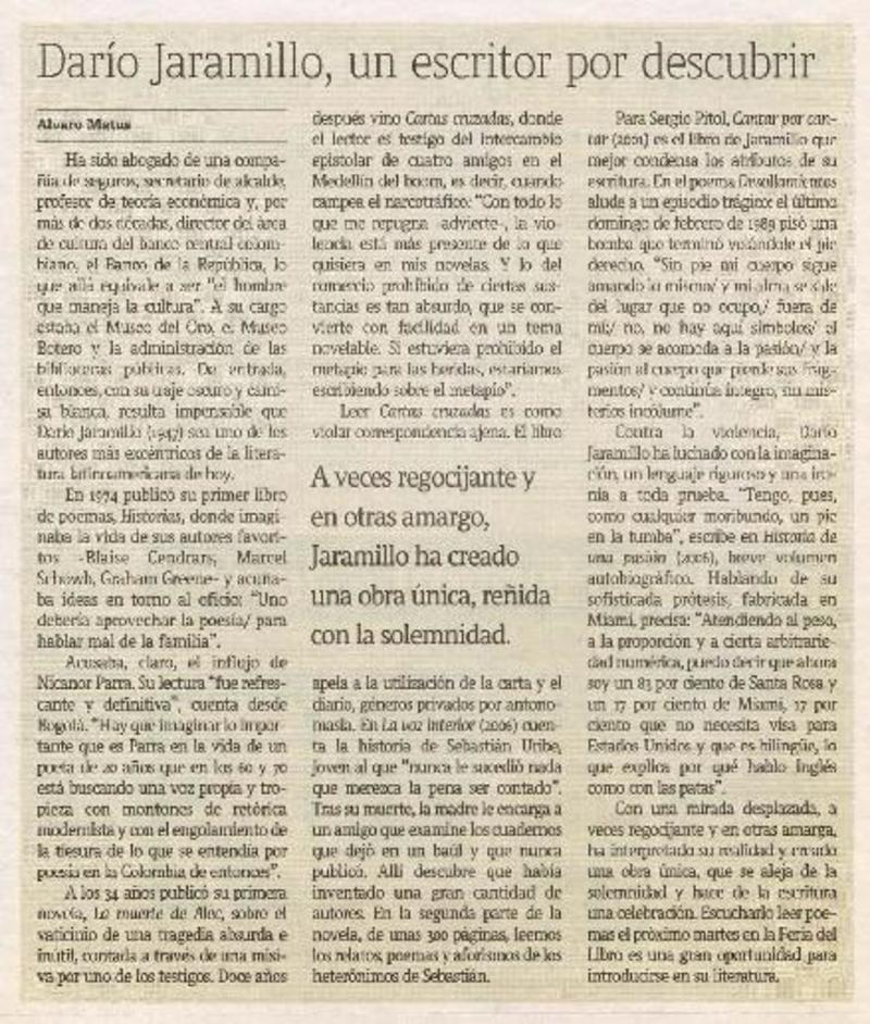 Darío Jaramillo, un escritor por descubrir [artículo] Alvaro Matus.