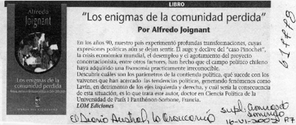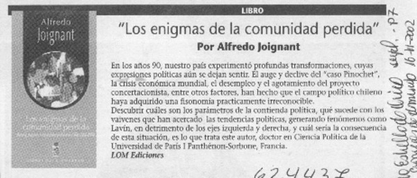 Enigmas de la comunidad perdida - Joignant M., Alfredo - Autores chilenos