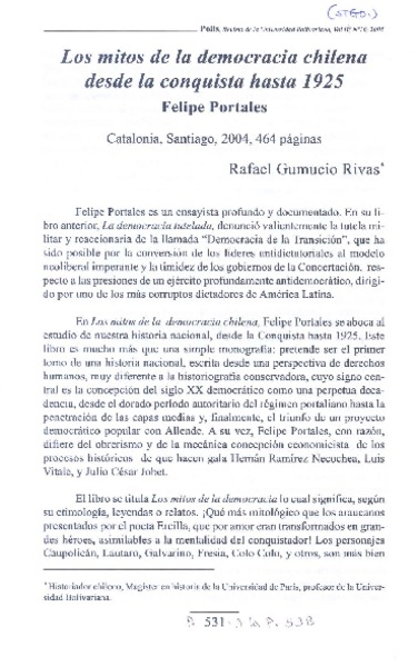Los Mitos de la democaria chilena desde la conquista hasta 1925. [artículo] Rafael Gumucio Rivas