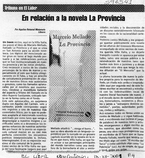 En relación a la novela La Provincia [artículo] Aquiles Retamal Matamala