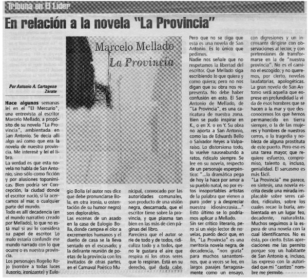 En relación a la novela "La Provincia" [artículo] Antonio A. Cartagena Zárate.