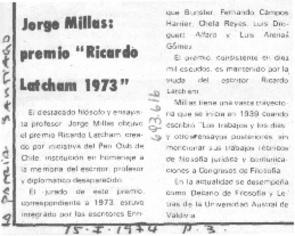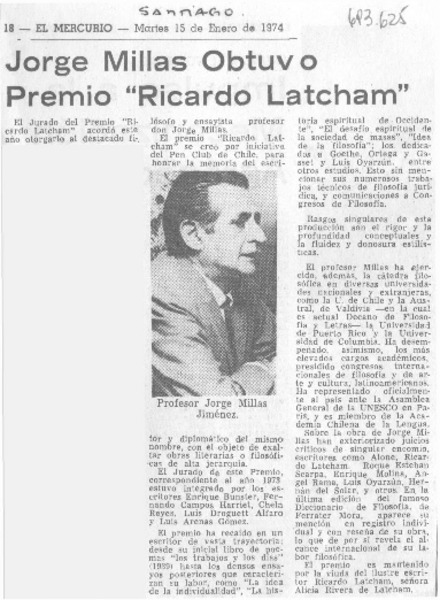 Premio póstumo para filósofo Jorge Millas. [artículo]