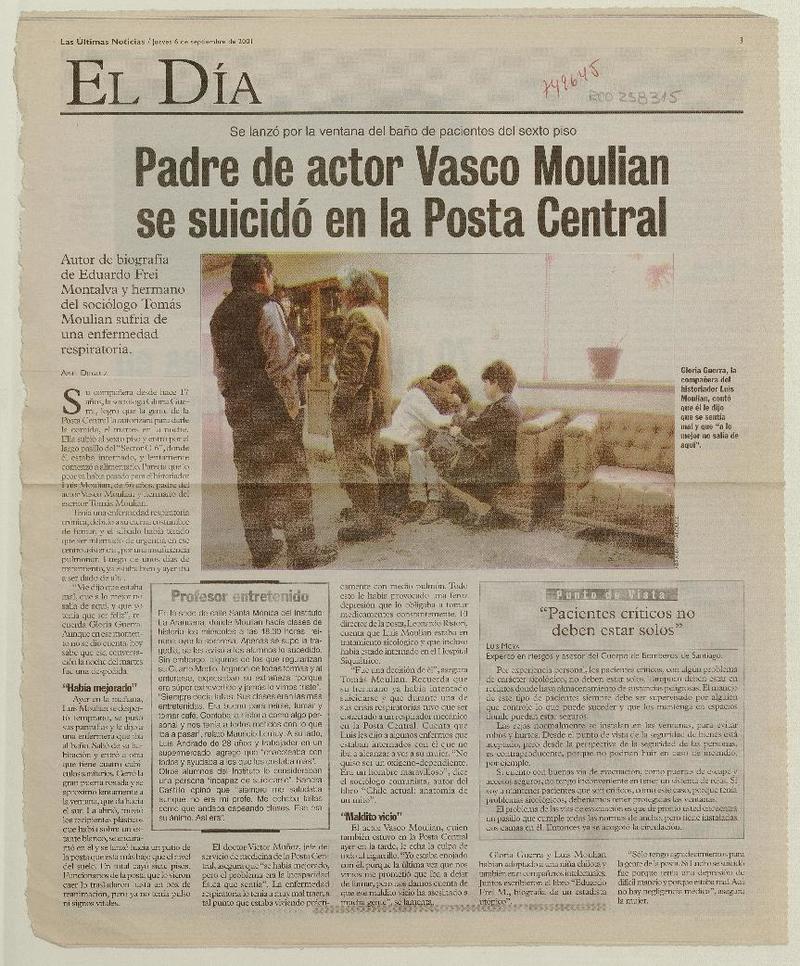 Padre de actor Vasco Moulian se suicidó en la Posta Central [artículo] Ariel Diéguez.