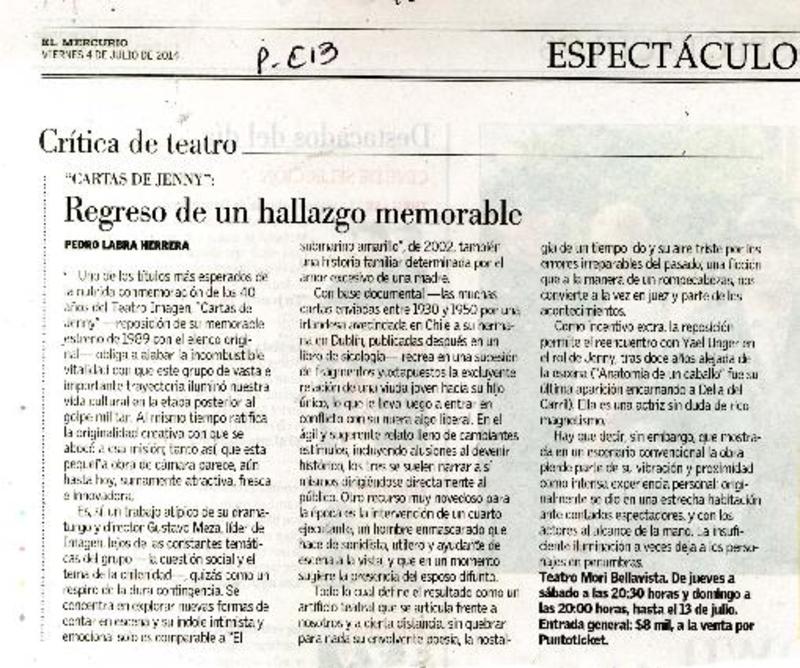 Teatro Imagen triunfó con "Cartas de Jenny" [artículo].