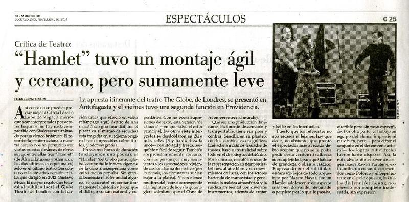 "Hamlet" tuvo un montaje ágil y cercano, pero sumamente leve [artículo] Pedro Labra Herrera