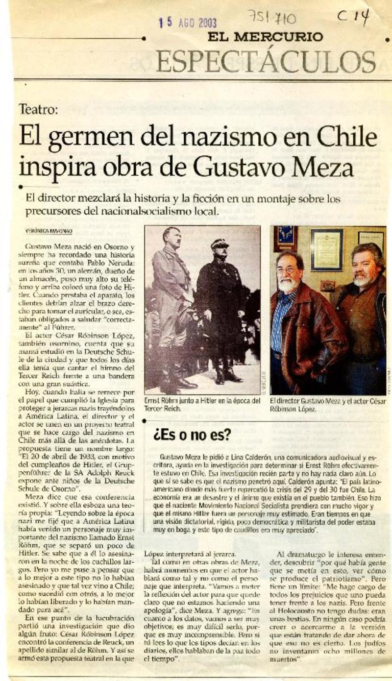 El germen del nazismo en Chile inspira obra de Gustavo Meza [artículo] Verónica Marinao.