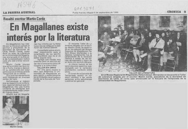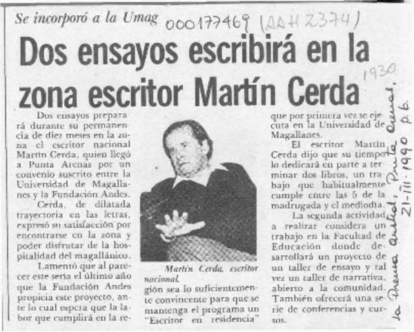 Dos ensayos escribirá en la zona escritor Martín Cerda [artículo].