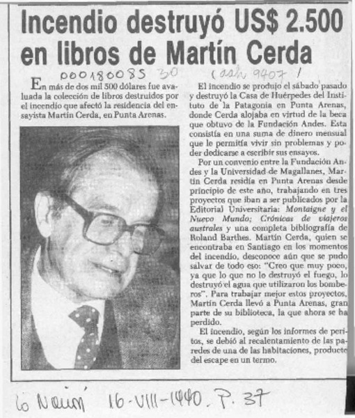 Incendio destruyó US$ 2.500 en libros de Martín Cerda [artículo].