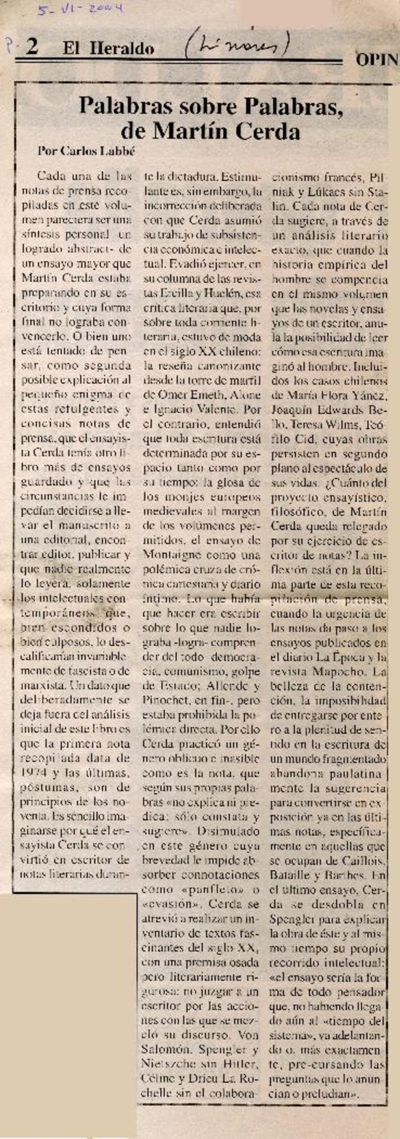 Palabras sobre palabras, de Martín Cerda [artículo] Carlos Labbé.