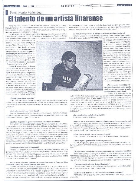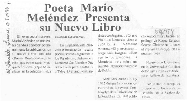 Poeta Mario Meléndez presenta su nuevo libro. [artículo]