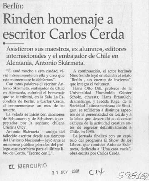 Homenajean al fallecido escritor Carlos Cerda. [artículo]