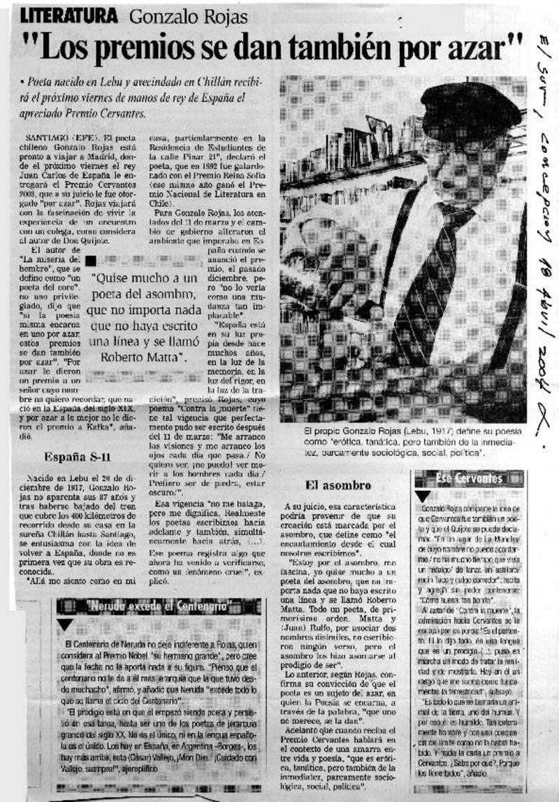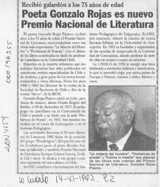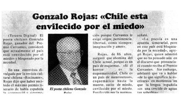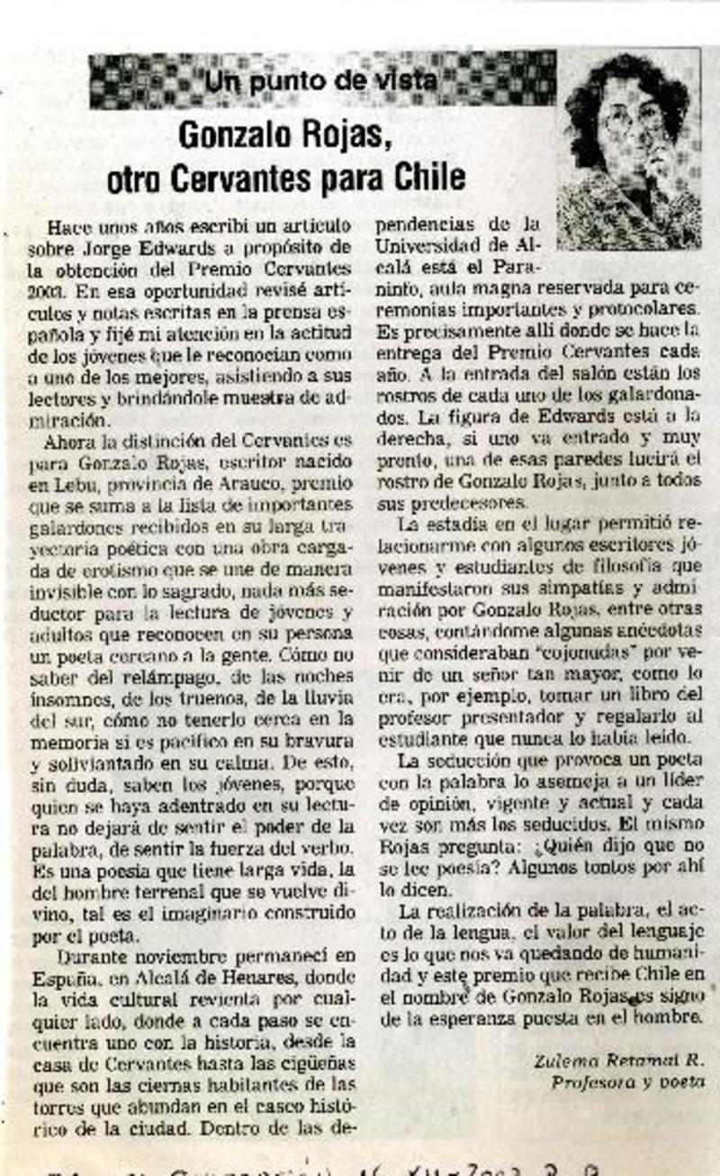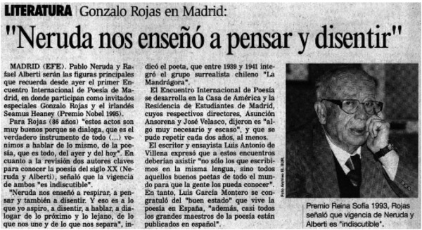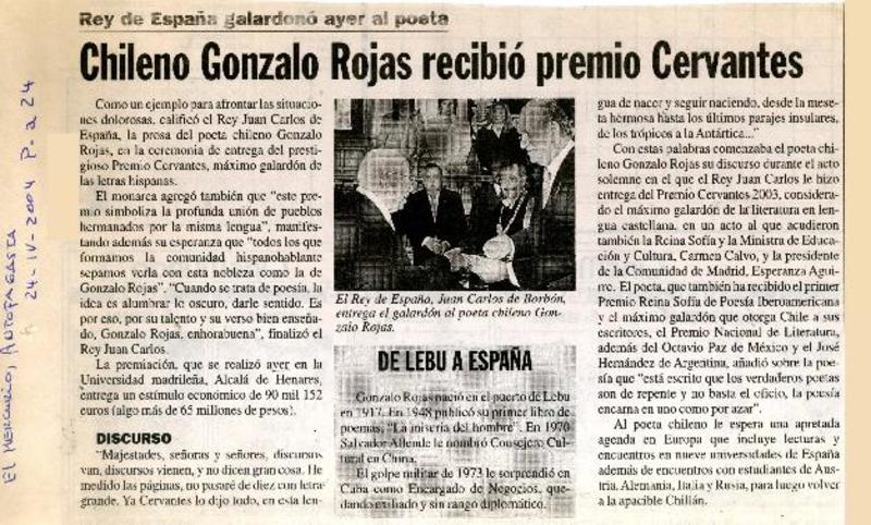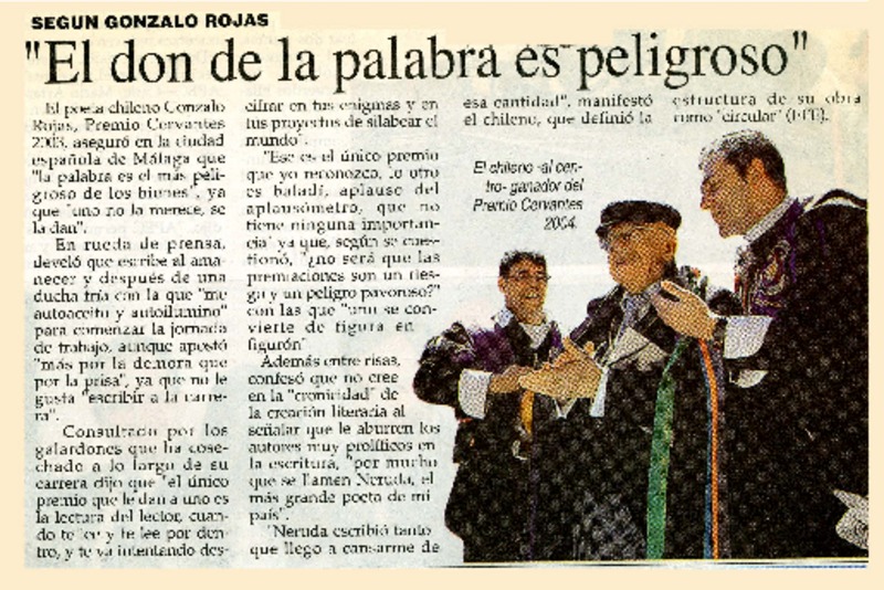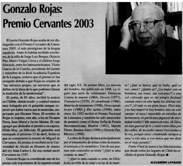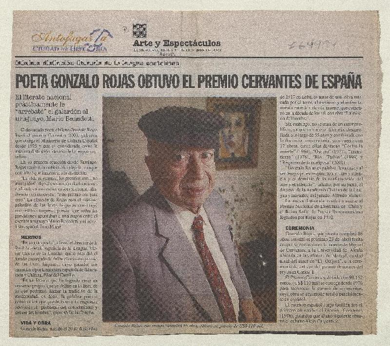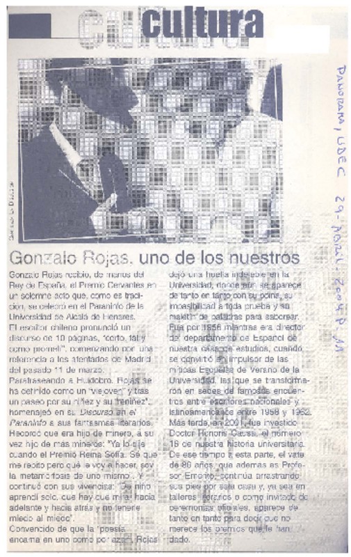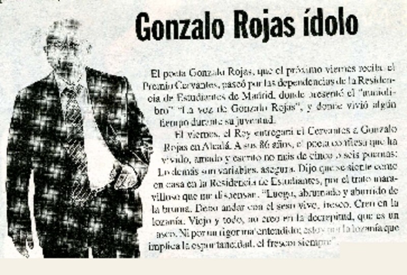 Chileno Gonzalo Rojas recibió premio Cervantes. [artículo]