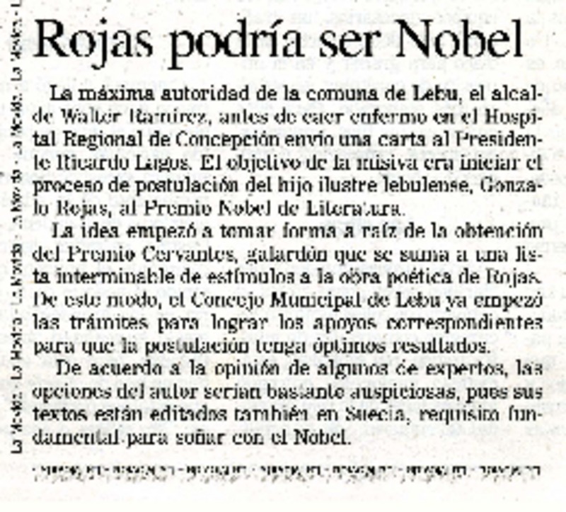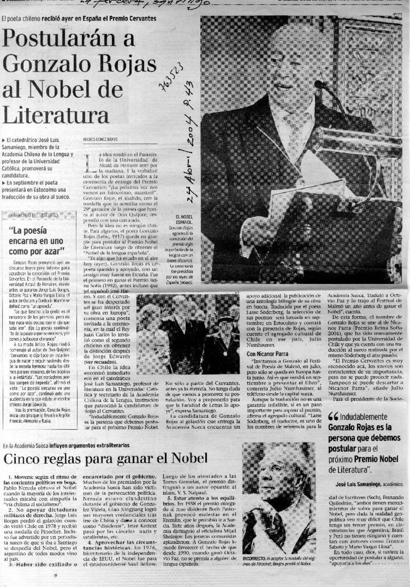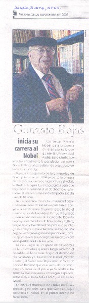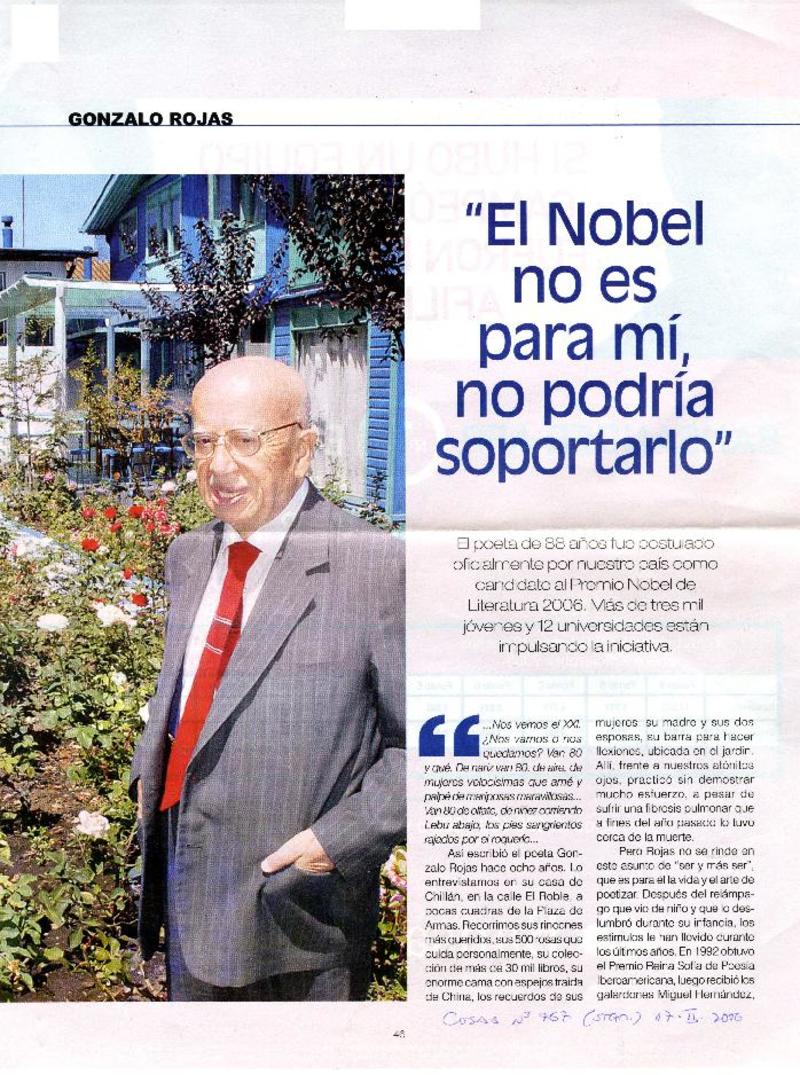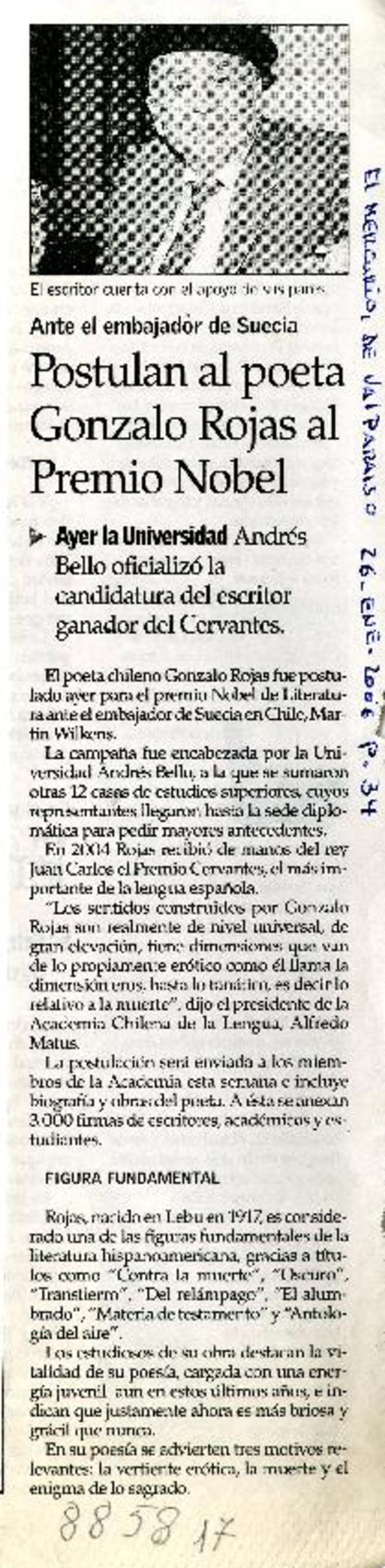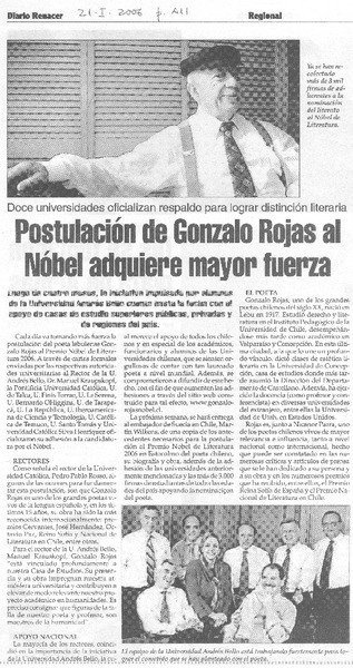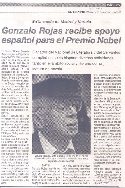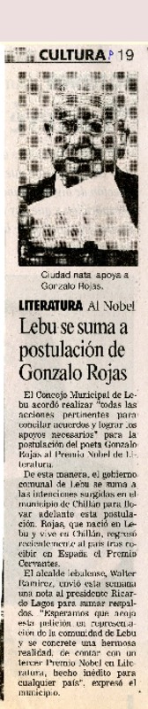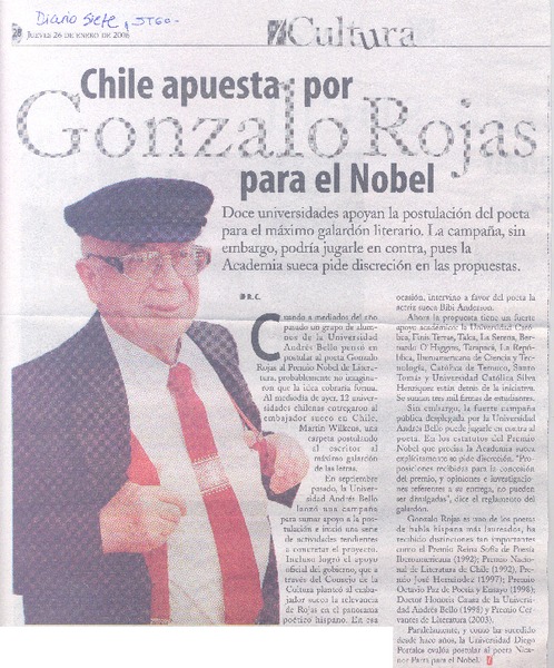 Chile apuesta por Gonzalo Rojas para el Nobel. [artículo] R.C.
