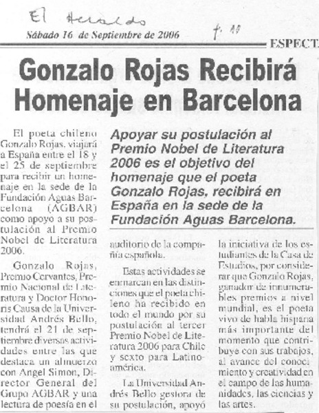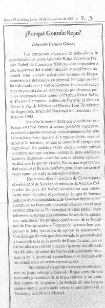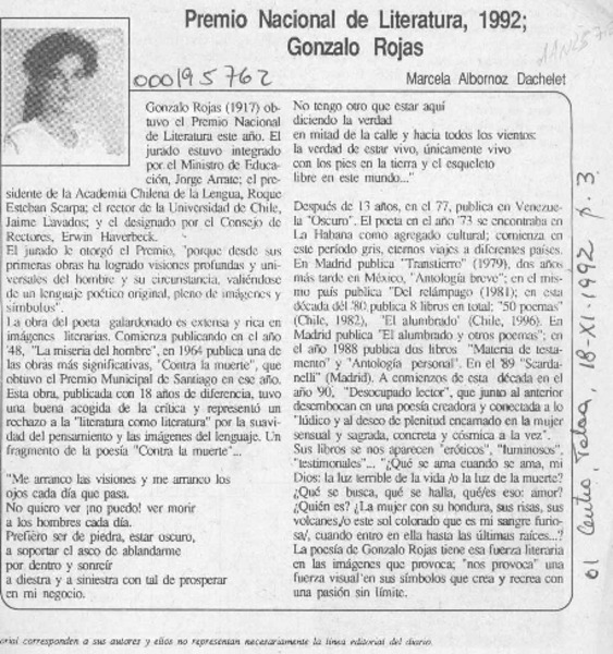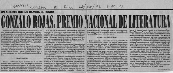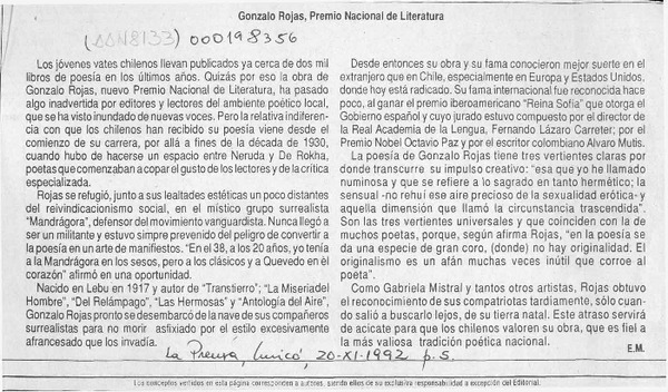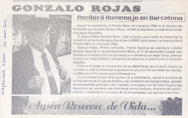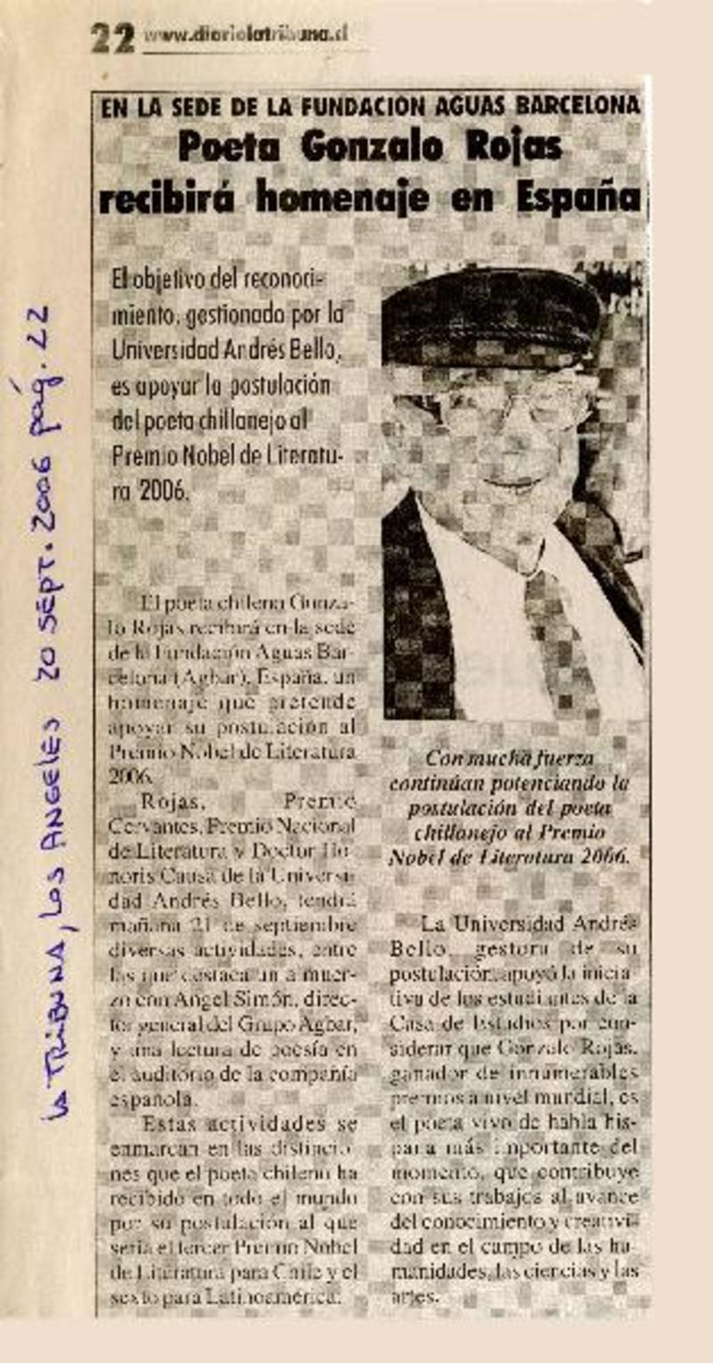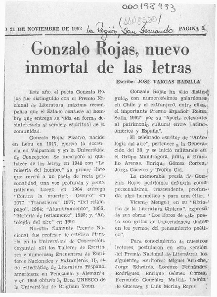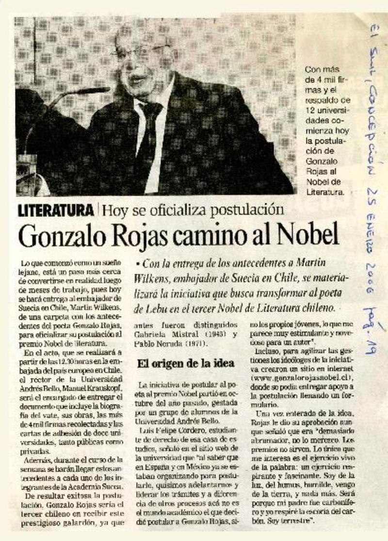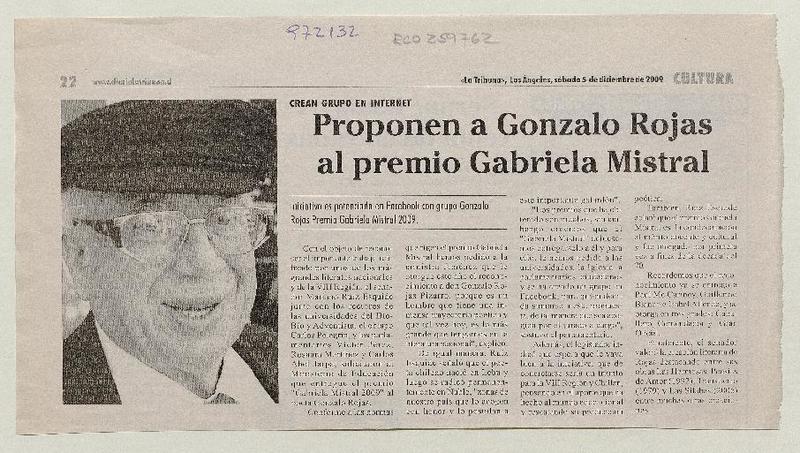 Chile apuesta por Gonzalo Rojas para el Nobel. [artículo] R.C.