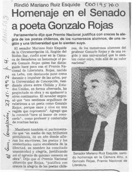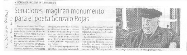 Senadores imaginan monumento para el poeta Gonzalo Rojas [artículo].