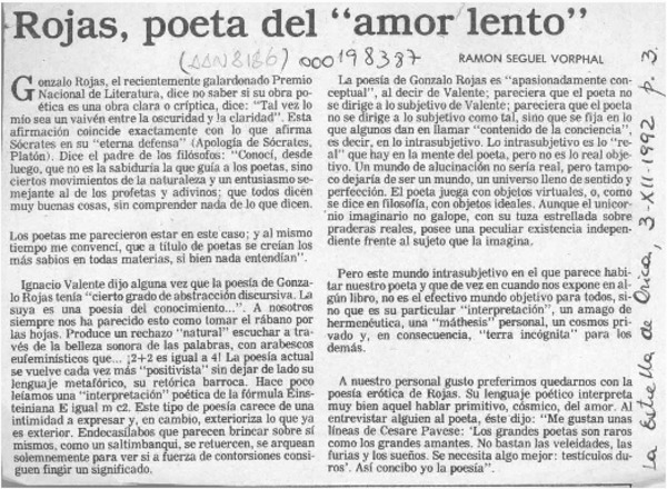 Rojas, poeta del "amor lento" [artículo] Ramón Seguel Vorphal.
