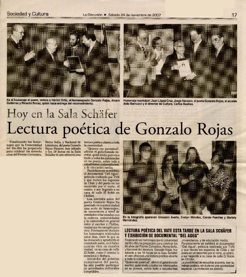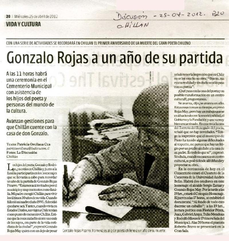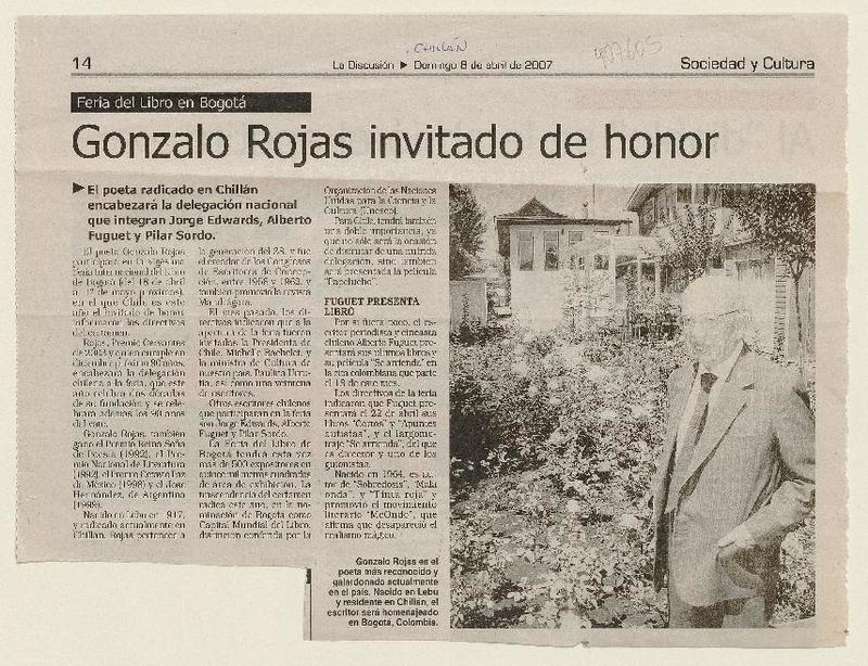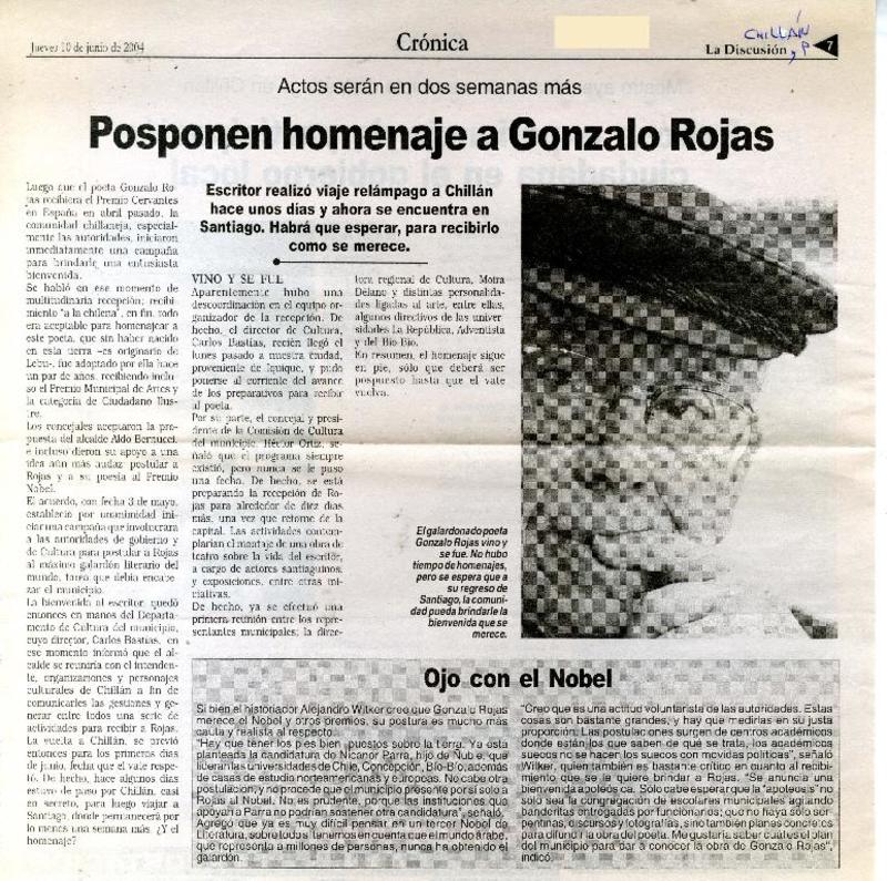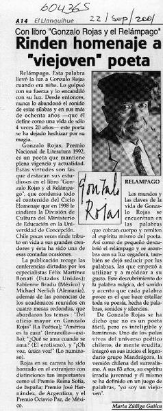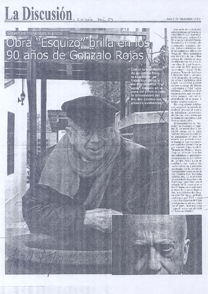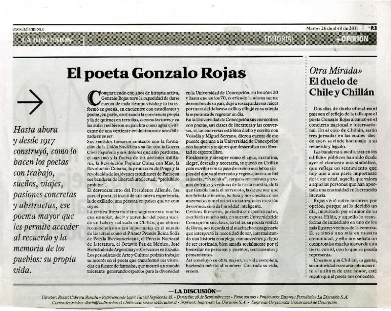 Chillán rendirá homenaje al poeta Gonzalo Rojas P. [artículo].