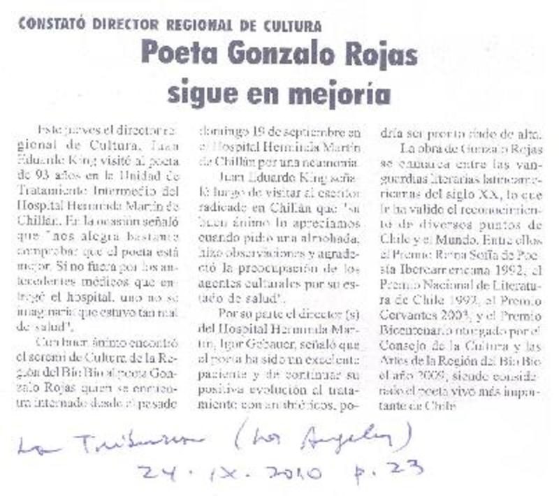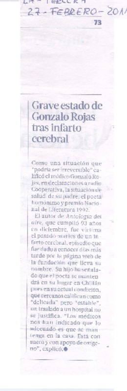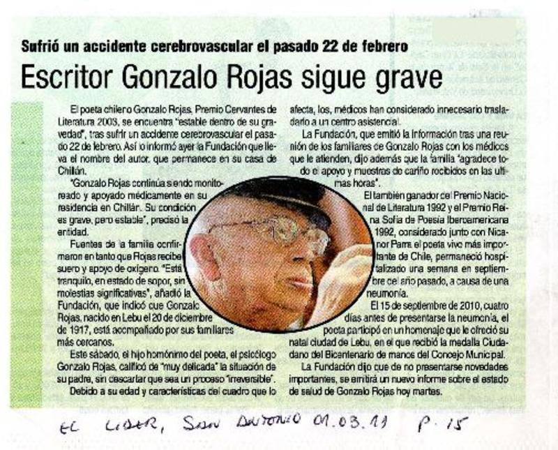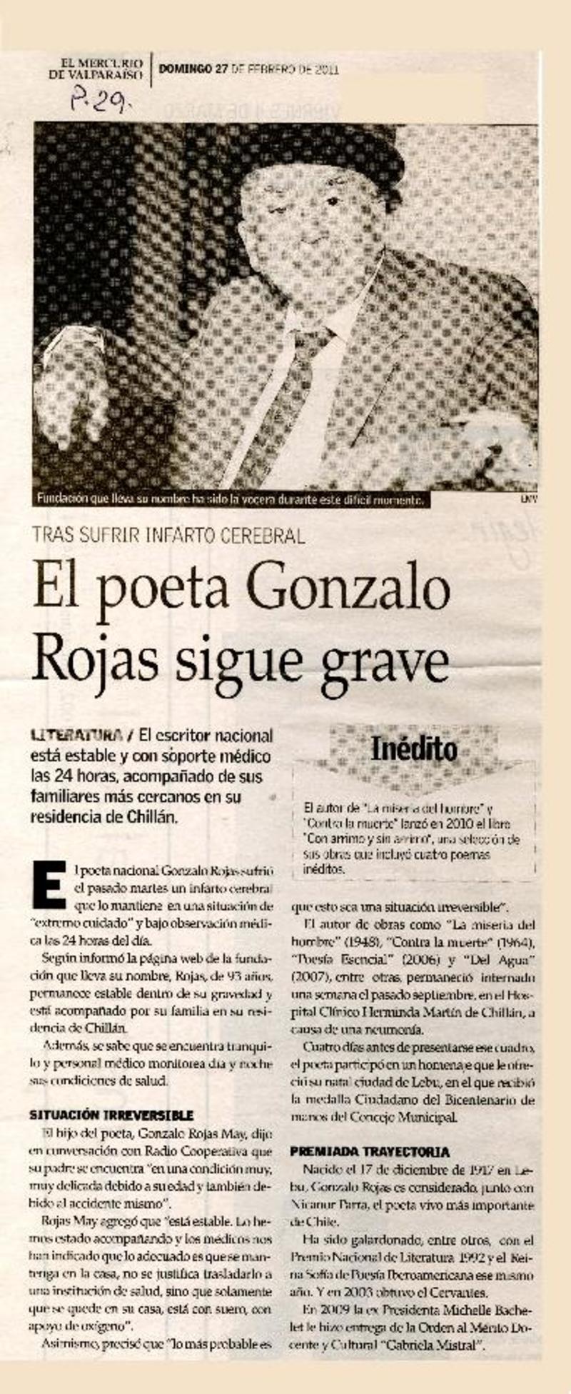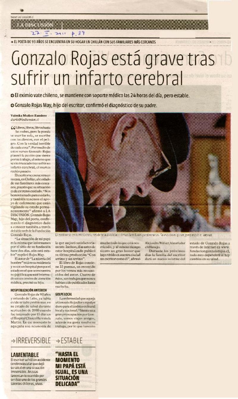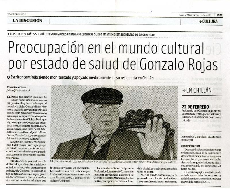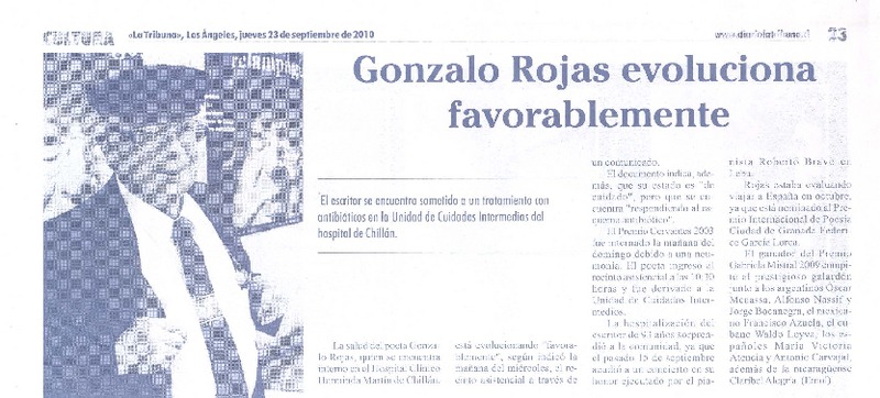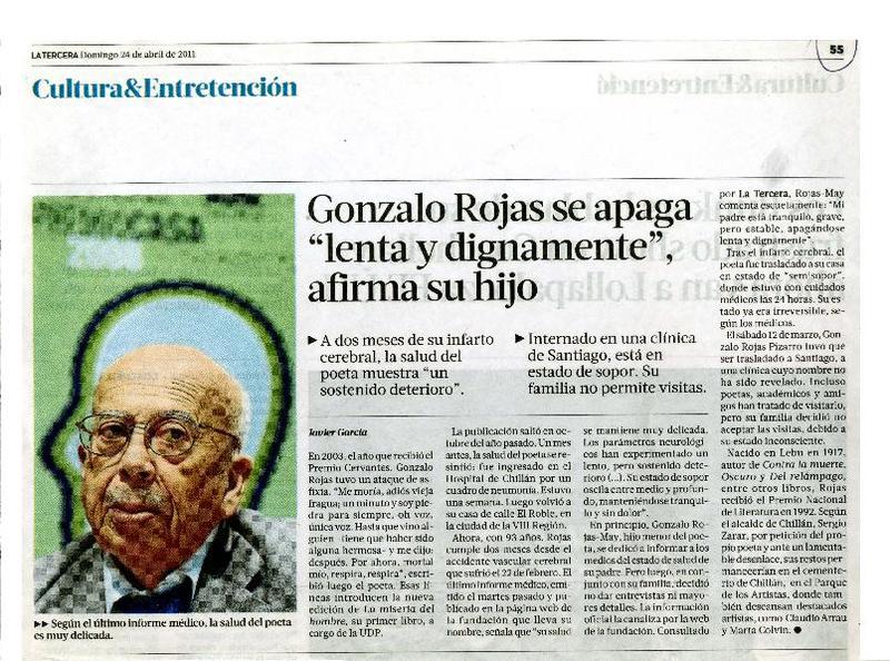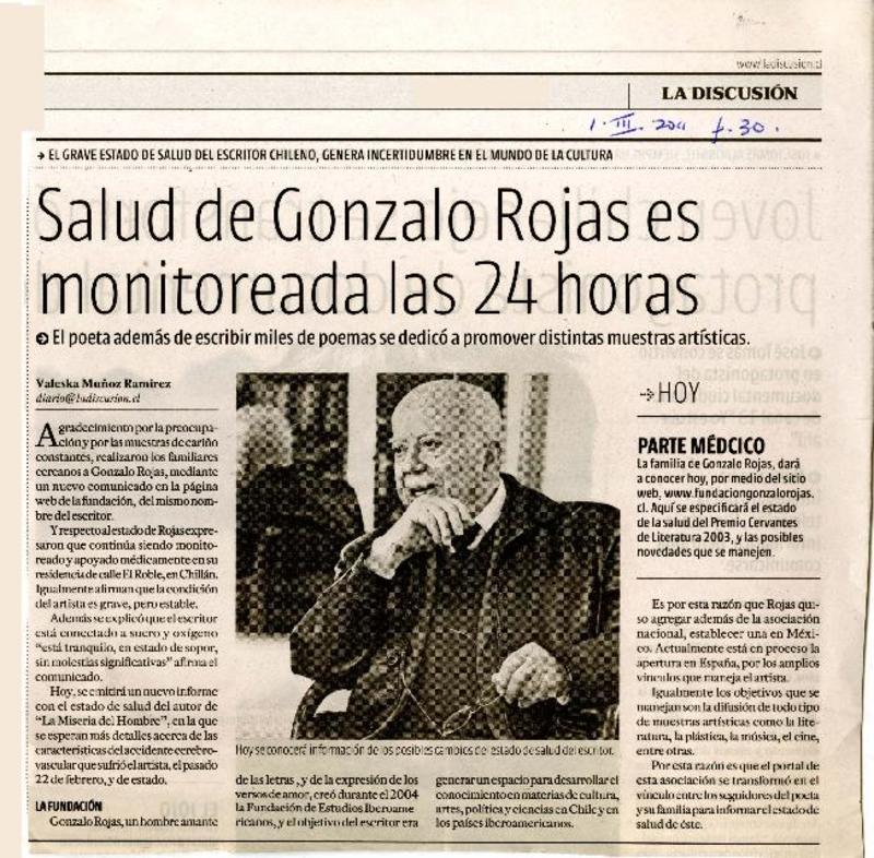 Salud de Gonzalo Rojas es monitoreada las 24 horas [artículo] Valeska Muñoz Ramírez.
