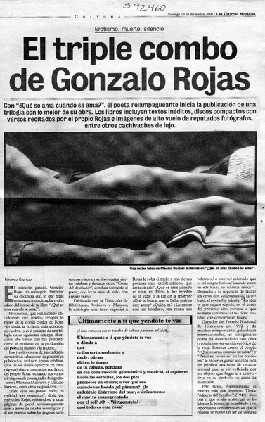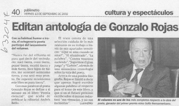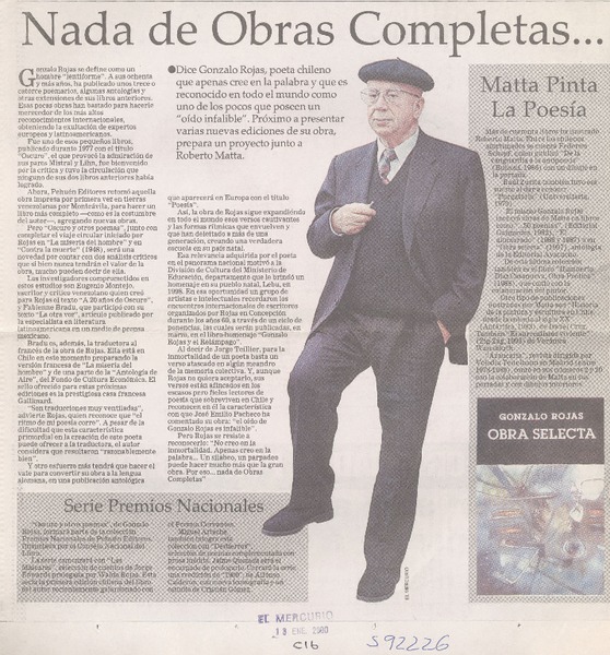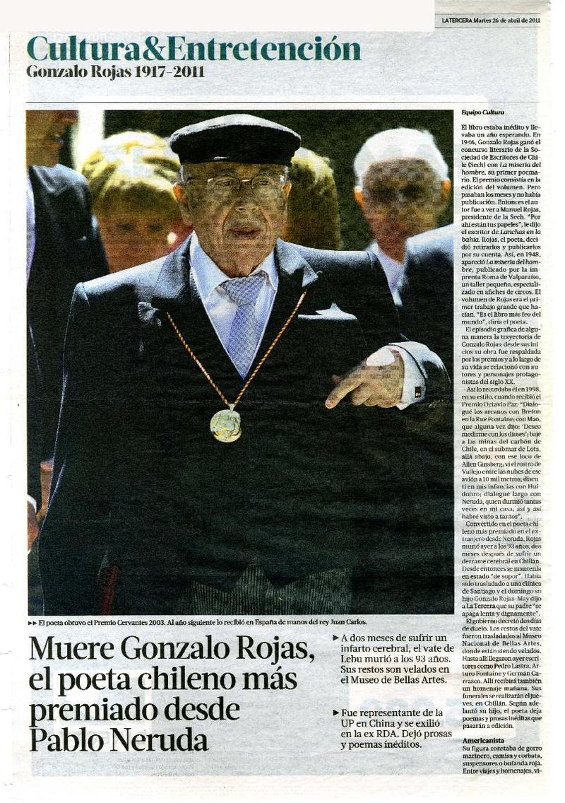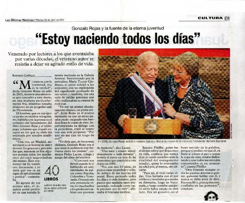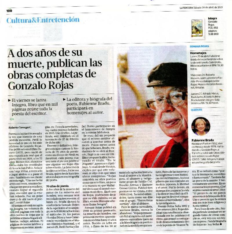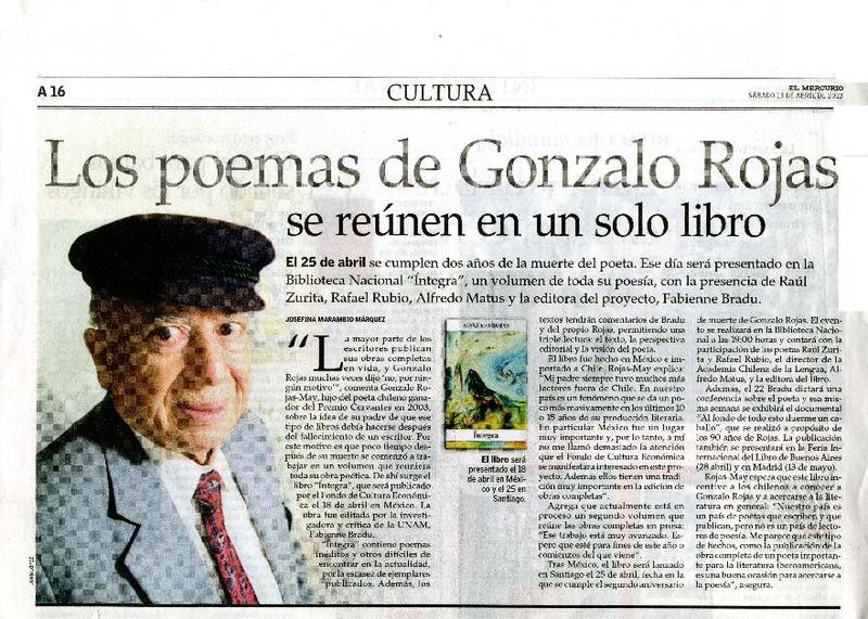 A dos años de su muerte, publican las obras completas de Gonzalo Rojas [artículo] Roberto Careaga C.