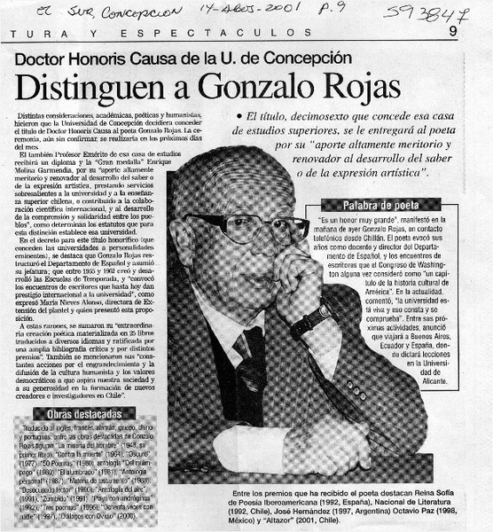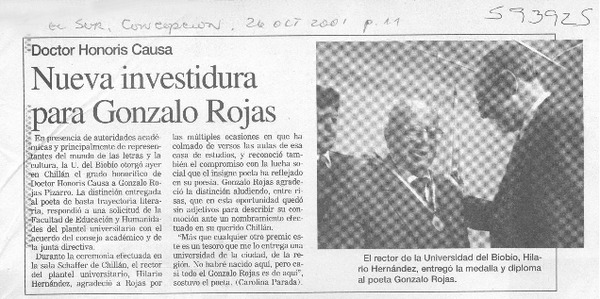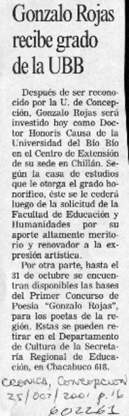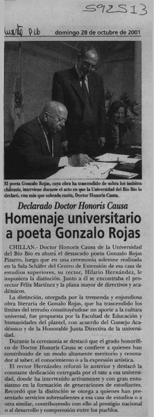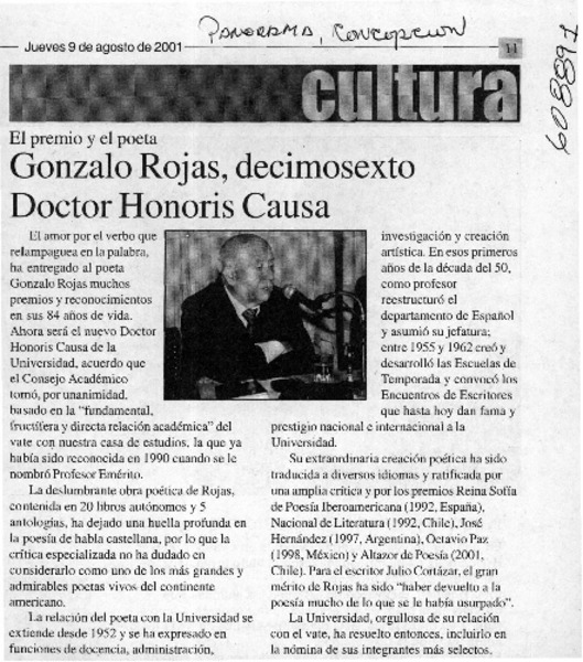 ULS otorga grado Doctor Honoris Causae al poeta Gonzalo Rojas. [artículo]