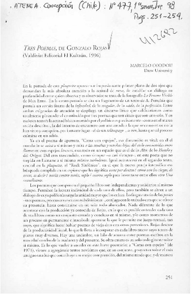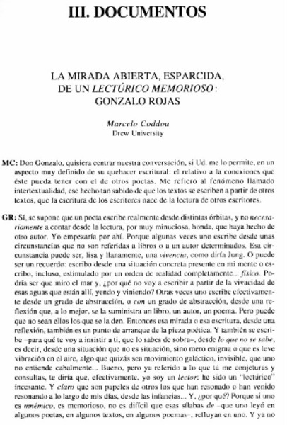 Tres poemas, de Gonzalo Rojas [artículo] Marcelo Coddou