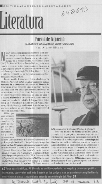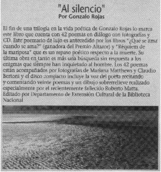 Al silencio" nueva edición de poemas de Gonzalo Rojas. [artículo]
