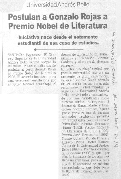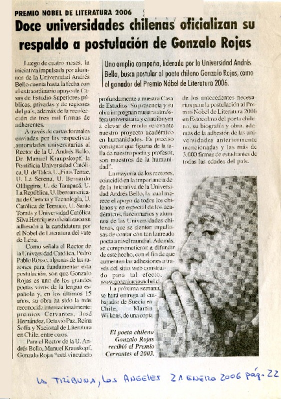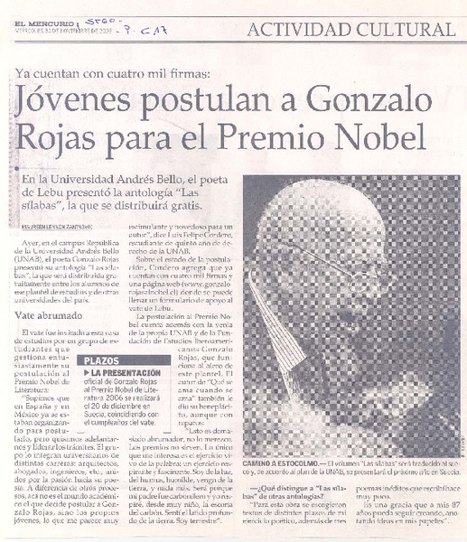 Ya cuentan con cuatro mil firmas : jóvenes postulan a Gonzalo Rojas para el Premio Nobel [artículo] Maureen Lennon Zaninovic.