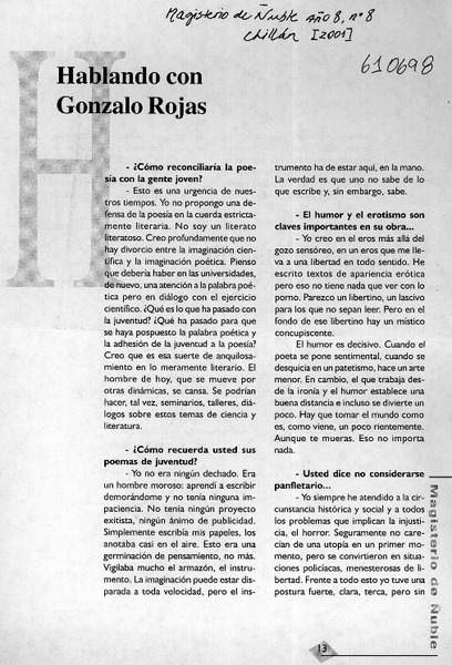 Charlando con Gonzalo Rojas [entrevista] [artículo] : Fernando Montoya Hurtado.