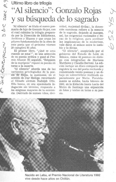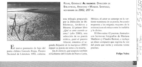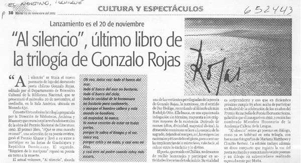Con lanzamiento de "Al silencio" culminó trilogía de Gonzalo Rojas [artículo] Patricia Orellana.