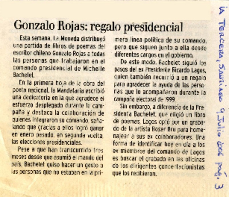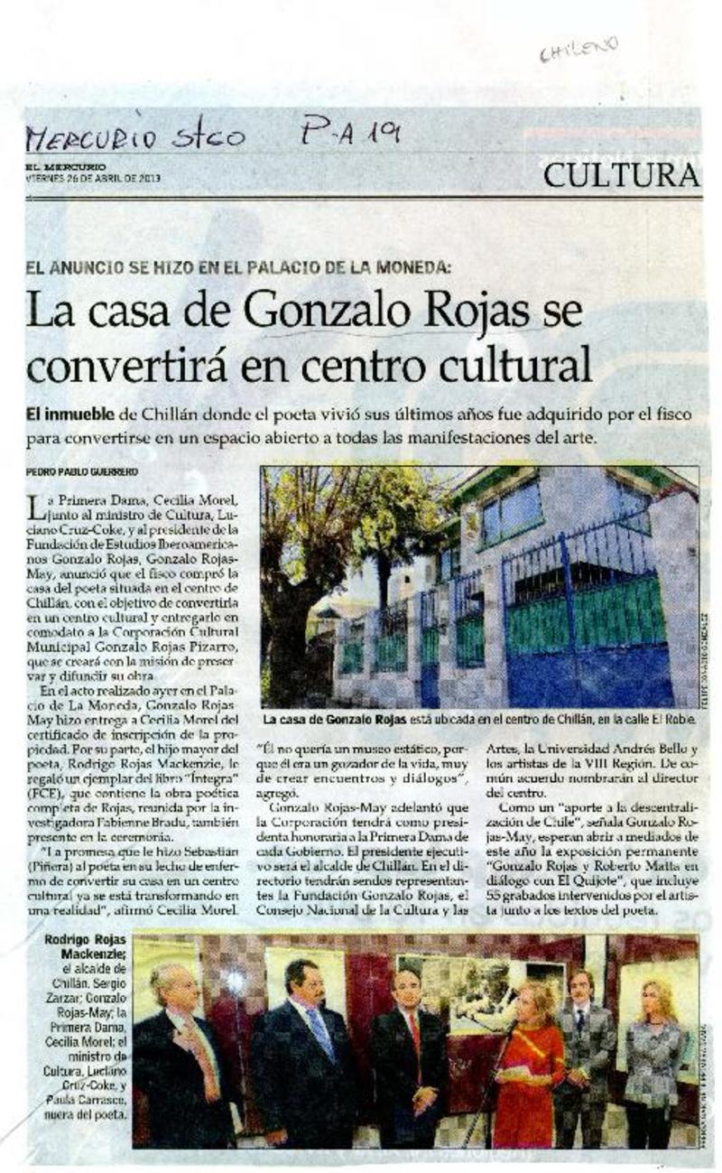 Cecilia Morel anunciará hoy la compra de la casa de Gonzalo Rojas [artículo] Carolina Marcos Ch.