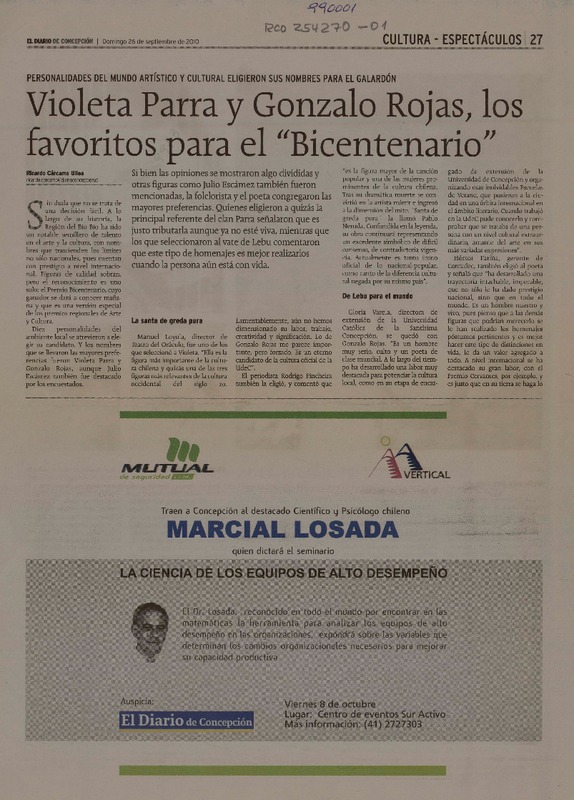 Violeta Parra y Gonzalo Rojas, los favoritos para el "Bicentenario" [artículo] Ricardo Cárcamo Ulloa.
